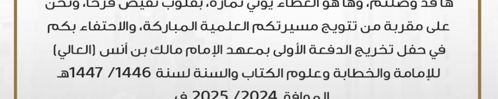 جني_الثمار بفضل الله وتوفيقه، شهد معهد مالك بن أنس العالي للخطابة وعلوم الكتاب والسنة يومًا استثنائيًا بتخريج الدفعة الأولى من طلبته المتميزين، في حفل مبارك . لحظات الفخر والامتنان امتزجت بالفرحة، ونحن نودّع كوكبة من طلاب العلم الذين أتموا رحلتهم في رحاب المعهد، حاملين معهم مشاعل الهداية والوسطية، متأهبين لخدمة الدين والمجتمع بعلم وبصيرة. نسأل […]